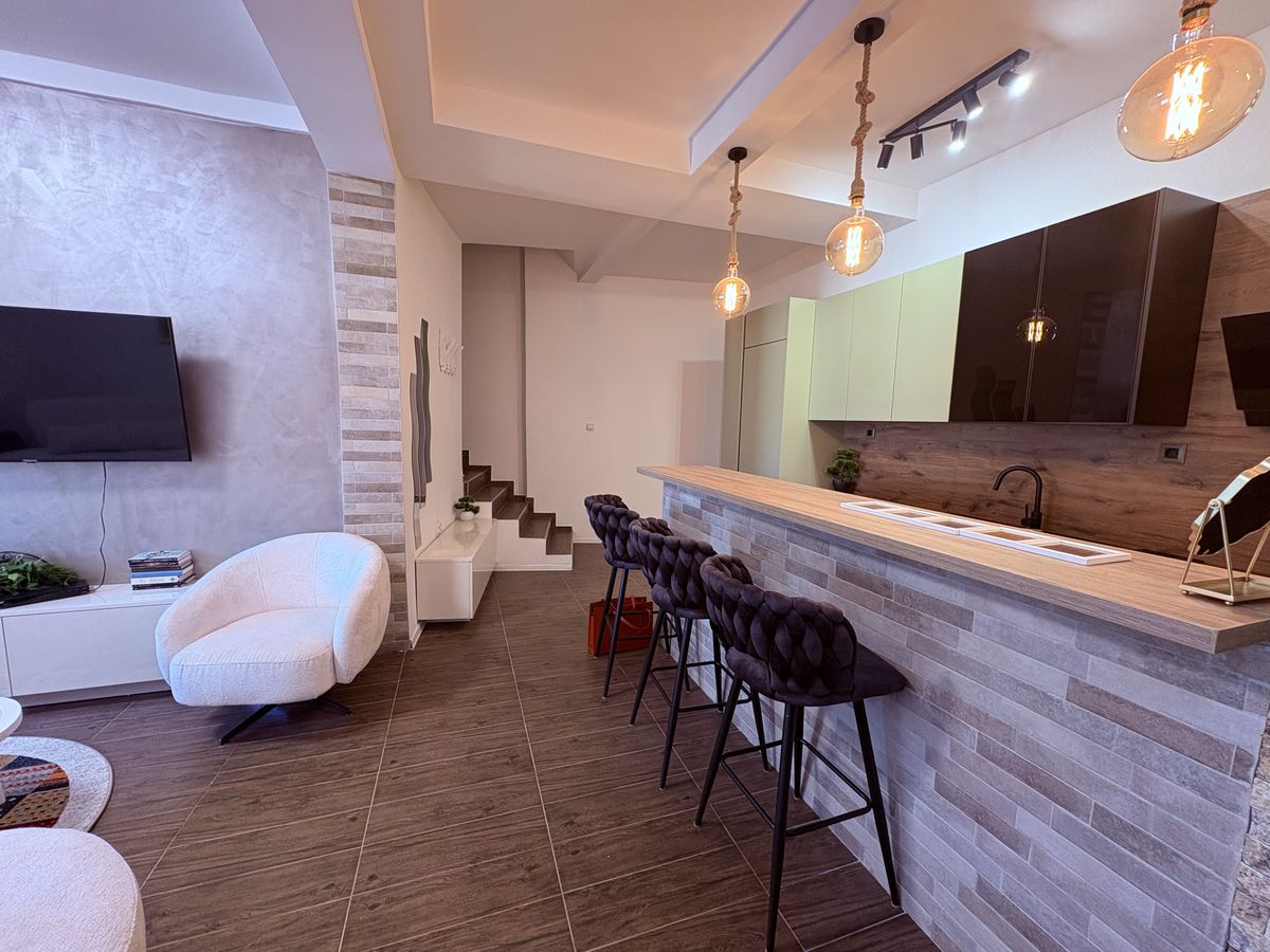 Trosoban nov dupleks stan od 70m2 za izdavanje, na trećem spratu u zgradi sa liftom, Centar. Stan se sastoji od velikog dnevnog boravka sa kuhinjom, spavaća soba, kupatilo, ostava i terasa dole i jedna manja radna ili spavaća soba sa garderoberom na spratu. Stan je nov i ekstra opremljen. Po podovima je keramika, PVC stolarija, grejanje na inverter klime, sigurnosna vrata. Stan je opremljen svim neophodnim nameštajem, kompletna kuhinja sa BOSCH - ovim el. uređajima, kao i svi ostali neophodni el. uređaji (TV, veš mašina i sl.). Nisu dozvoljeni kućni ljubimci.